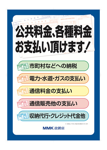 市町村などへの納税、電気・水道・ガスの支払い、通信料金の支払い、通販の支払い、収納代行・クレジット料金など各種料金がスーパーマーケットの店内でお支払いいただけます。