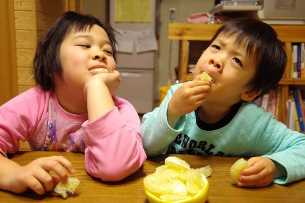 口の中には文旦が入っているのに、もう片方の手で次の文旦をしっかりゲットしてます。