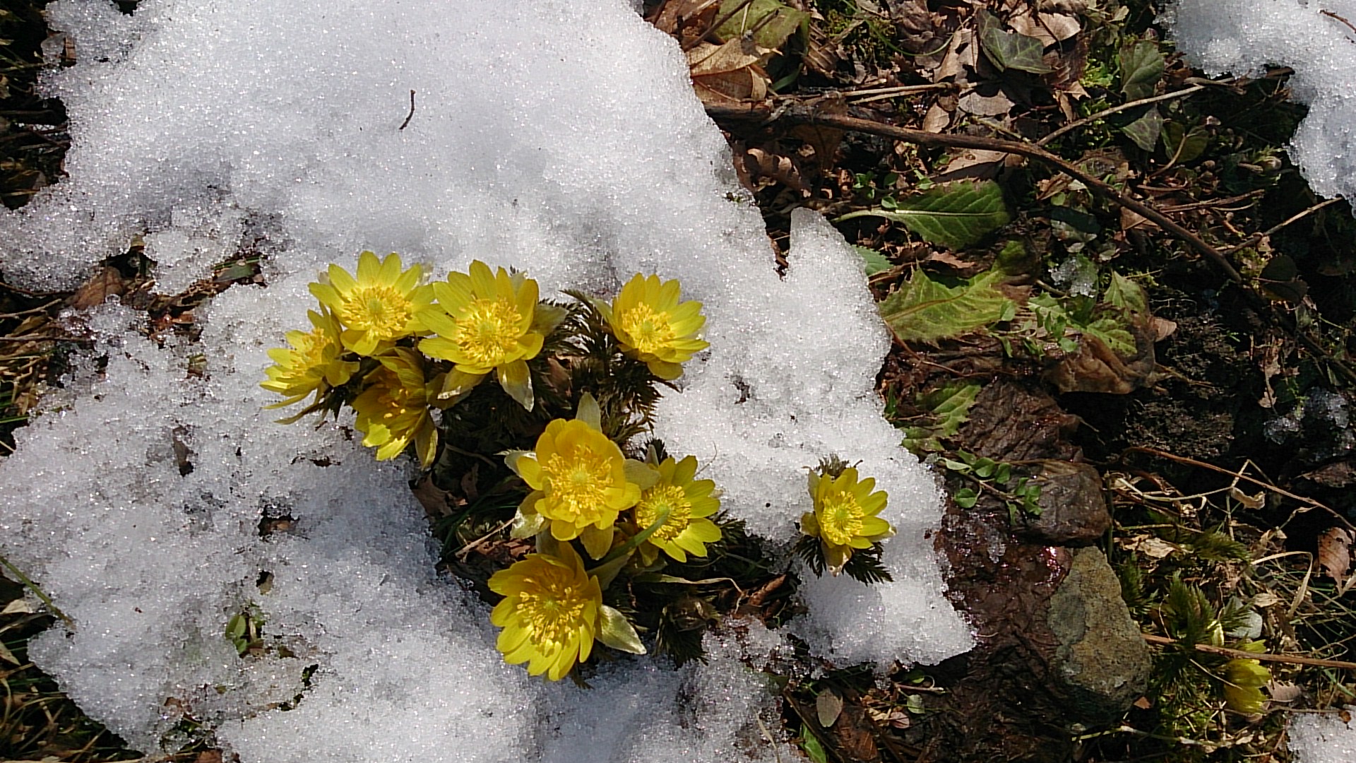 福寿草が雪に埋もれていて、まだ顔を覗かせて