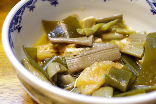 こちらはその保存したイタドリを昆布と油揚げで、ちょっと甘めに煮たものです。