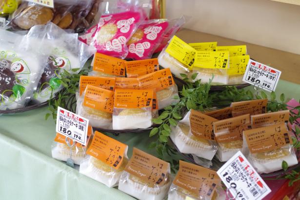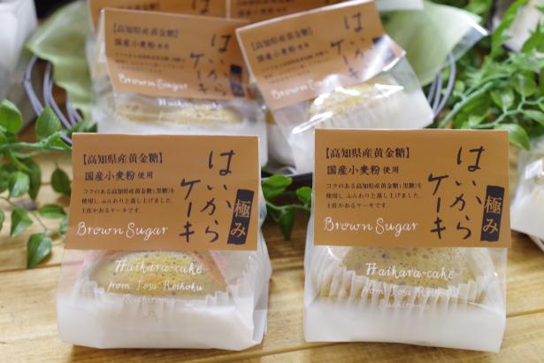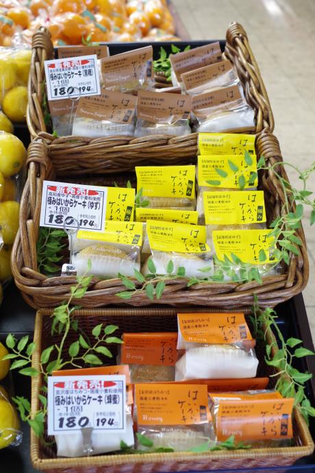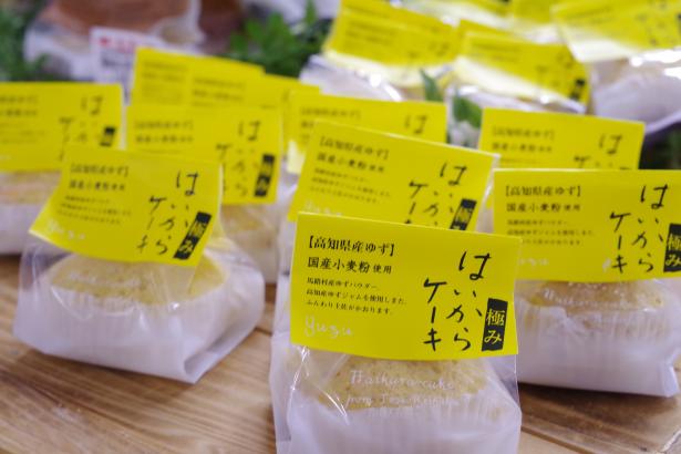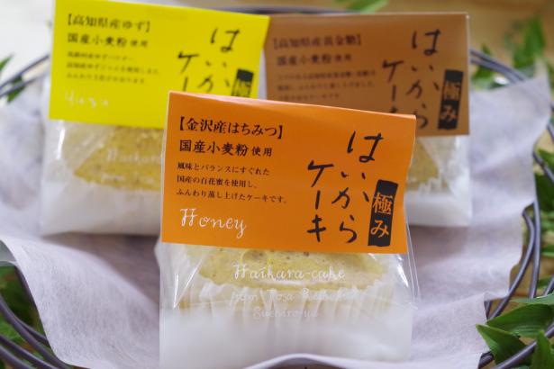 今までの「はいからケーキ」と大きく異なったのは、国産原料にこだわり、国産小麦粉を使用しております。全部で3種類のフレーバーがあり、一番人気のはちみつに、ゆず、黒糖が加わっております。この画像は柚子のフレーバーで、馬路村のゆずパウダーに高知県産ゆずジャムを使用しております。また、ケーキ上部にはゆず皮をまぶしておりますので、ふんわりゆずの香りを感じることができます。ここだけの話ですが、ゆず味はパッケージの印字ミスがあって、先ほど気づいちゃいました・・・(汗)しばらくはこれで行かざるを得ませんが、次回にはちゃんと修正したものを。どこに印字ミスがあるか探して見て下さい(苦笑)