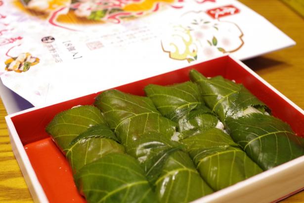 桜の葉っぱで巻くお寿司はあまり見ることはありません。桜餅ぐらいしか思い出せませんけど、あとは柿の葉寿司が有名ですよね。桜の葉のにおいがちょっときつかったので、葉をのけて食べました。