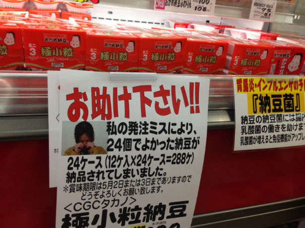 すると、本来納豆を24個発注すればよかったのですが、発注単位を間違え、なんと12個入り×24ケースが納品されました。ということは、288個の納豆が朝店に来ると山積みされていました。更にはおおとよ店の納品分も同様で、全部で580個近い納豆があったのです。