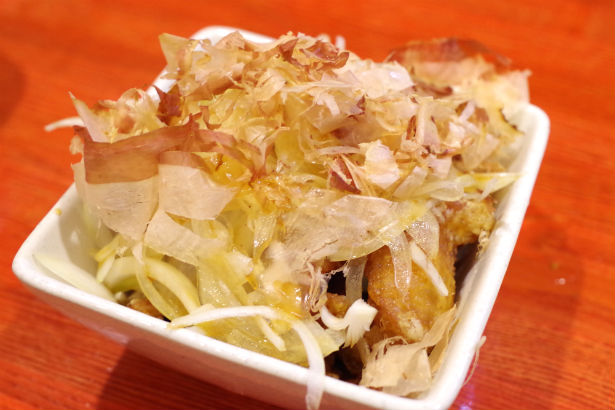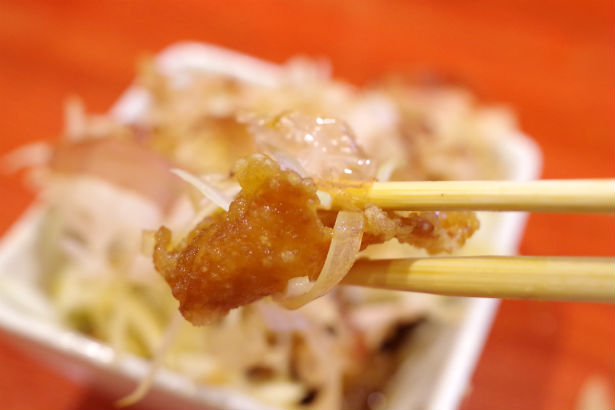 鶏の皮の唐揚げに玉ねぎのスライスを混ぜ合わせたものです。ポン酢をかけてさっぱりと頂きました。