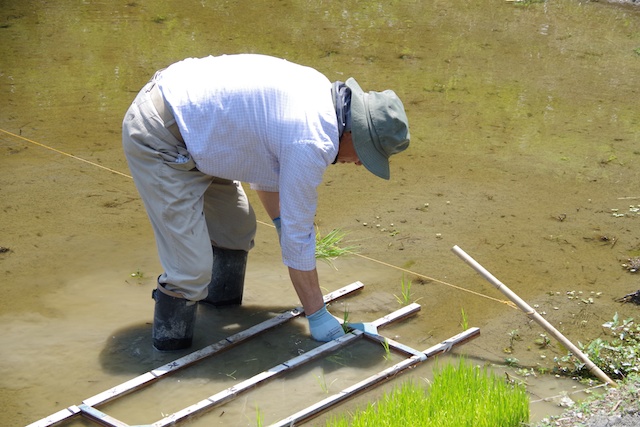 人間が手で植えて行きますので、まっすぐに田植えできるように、このような定規みたいな木枠を使って田植えをしていきます。
