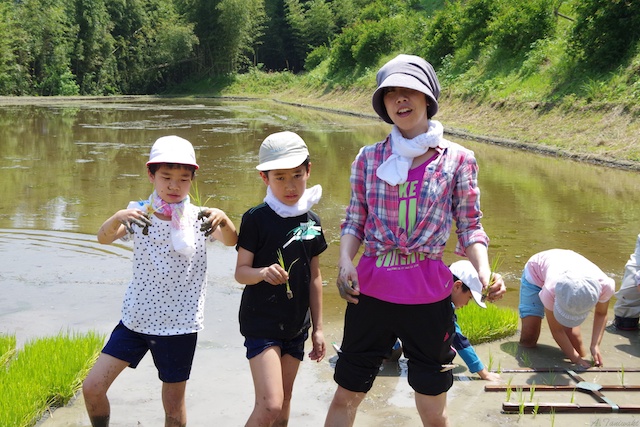 子供達も始めて田んぼに足を取られながら、一緒に参加しようと必死です。この田んぼには農薬を使っておりませんので、色んな生き物がどっさりいます。おたまじゃくしにカエルはもちろん、アメンボにトカゲなどなど。子供達は田植えより生き物を捕まえるほうに興味があるようでしたけど、強制参加です(笑)