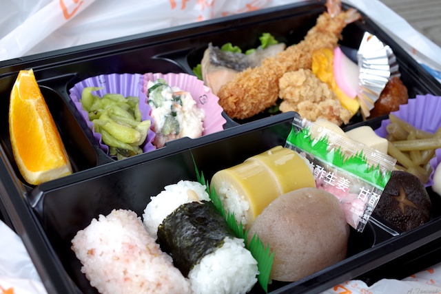 すえひろおんちゃんのお米を使ったおにぎりに筍やこんにゃくの田舎寿司も入っていました。更には山菜にリュウキュウの酢の物まで。お腹いっぱいになるご満悦のお弁当でした。
