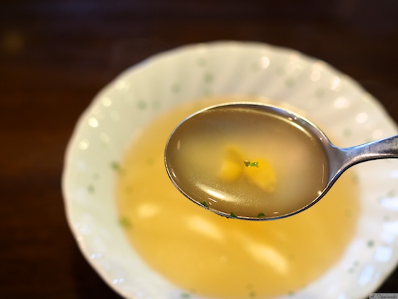まず出てくるのが、シンプルなコンソメスープです。