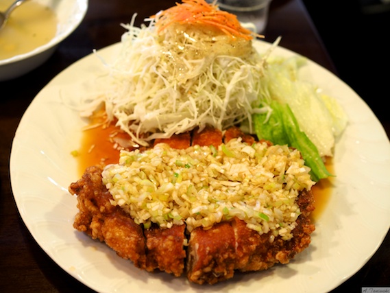 揚げた鶏肉の上に、たくさんのきざみネギが乗っており、食欲がそそります。奥に見えるのはキャベツたっぷりのサラダですが、このサラダにかかっているドレッシングがこれまた美味しいんです!出て来た時は、こんなにもたくさんあるキャベツが食べれるろうかと思ってしまいますが、このさっぱりしたドレッシングであっさりと食べれてしまうのです。このオリジナルドレッシングを小売りしてもらえたらと思うほどです。