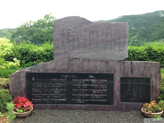 川の流れのようにの歌詞と楽譜が刻印されています。美空ひばりは、昭和22年に地方巡業をしている途中、大豊町でバス事故に遭遇し九死に一生を得ました。 そして、一ヶ月半の療養後、町内にある国の特別天然記念物「杉の大杉」に「日本一の歌手になれるように・・・」と願をかけました。そして、14歳の時に、当時お世話になった方々への挨拶をかねて大豊町を訪れ、日本一の誓いも新たに「杉の大杉」に参拝し、大豊町には2回訪れています。
