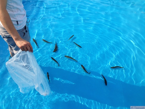 アメゴは水温に敏感の魚のようで、実際につかみ取りをやる時間帯まで、プールで保つのかが一番の問題でしたが、開始時間を3時(15:00)を13:00時と間違えるトラブルもあったり・・・(汗)なんとか、つかみ取りをやるまでには間に合い、子供達は必死にあめごを追っかけていました。