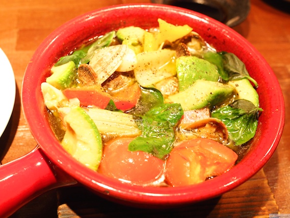 こんなに野菜がたっぷり入ったアヒージョは初めてかもしれません。以前に食べたアヒージョとは全然異なるものですね。オリーブオイルとニンニクで煮込む料理ですので、中身はそれに合えばなんでもいいのかもしれません。やはりバケット(パン)とよく合いますので、ワインも進みます。
