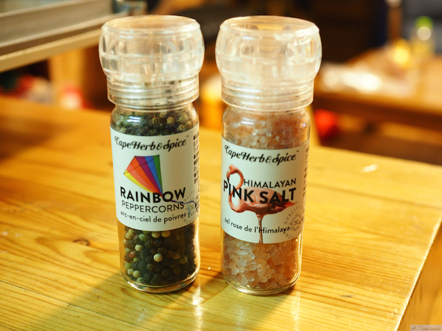 こちらは、CGCのヒマラヤ産のピンクソルトと、レインボーペッパーです。いずれもミル付きですので、ちょっとオシャレに塩コショウをすることができます。