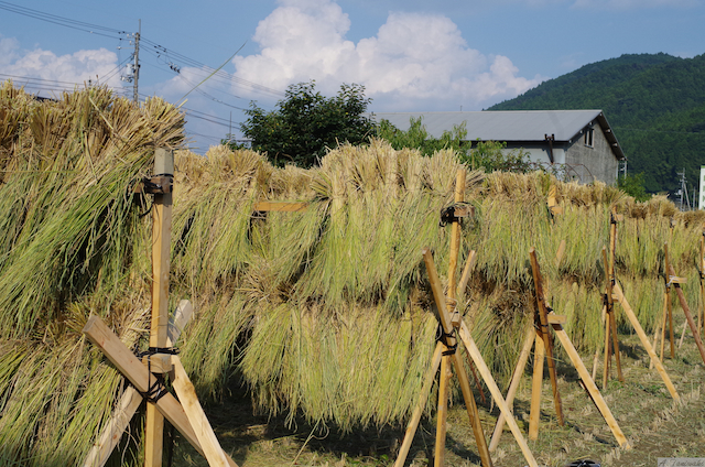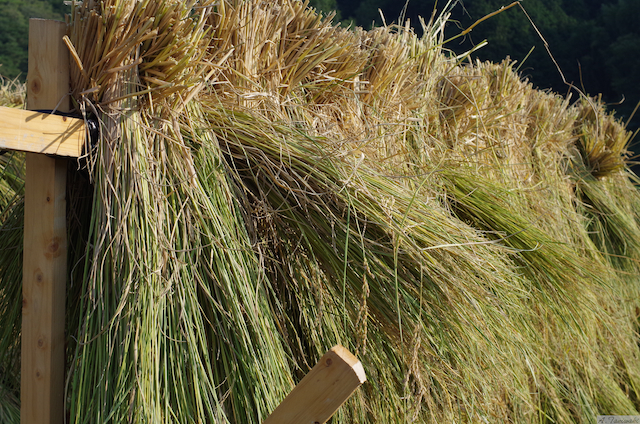 午前中には稲刈りを終わっていたのですが、午後から社員一同とお手伝いしたのは、刈った藁を田んぼ一面から集めて来て、それを干す作業です。こんな光景をよくみることがあるかと思いますが、それは稲穂がついた稲を干すために行っているものです。