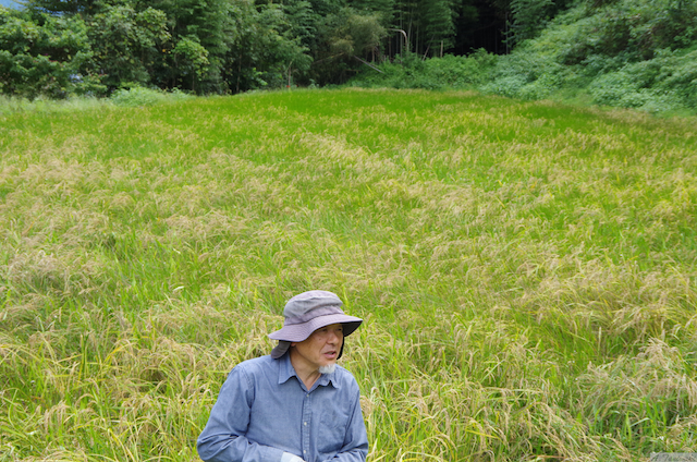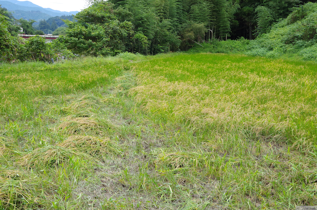上の画像を見てもわかるように、稲より草の方が多いぐらいです(笑)奥の方なんかは特に青々としており、草だらけなのがおわかり頂けるのではないでしょうか。更には今年の大雨の影響を受け、この田んぼも水に浸かりました。その水に流されている個所もあって、いくつかの稲は倒れてるもあります。この田んぼで約1.5反あり、通常で3俵(約180kg)ぐらいお米が取れるのですが、今年ももっと少ないかもしれません。