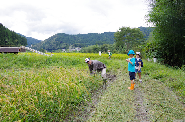 特に草が多いので、どこを刈ったらいいのか悩みます。自分が田植えしたお米がどうなっているのかも気になっていましたが、とにかく刈らないと終わりませんので必死です。子供達は最初こそ興味津々で取り組みますが、後半になると飽きてくるようで、泥で遊んだり、流れている水路の水に浸かったり、生き物を捕まえたりと、ほっておいても遊ぶには事を欠きません。