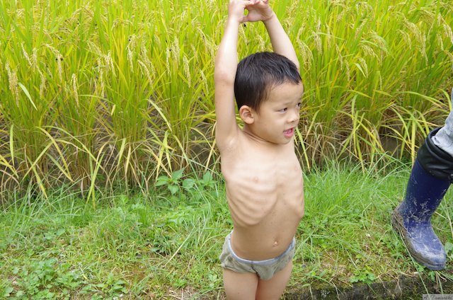 稲刈りはそこそこに、水路で遊んでいるかと思ったら、気がついたら裸になってました!水遊びが楽しいのはわかるけど、そこまで没頭できることに、親ながら恥ずかしい感じです。ほんのわずかな水路でも色んなことを思いついて、びしょびしょになるまで遊べるのは逆に羨ましくもありますが。今年は特に雨が多かったので、川で泳ぐこともできず、海にもプールにも行かなかったもので、遊びたいのはわかりますけどね。