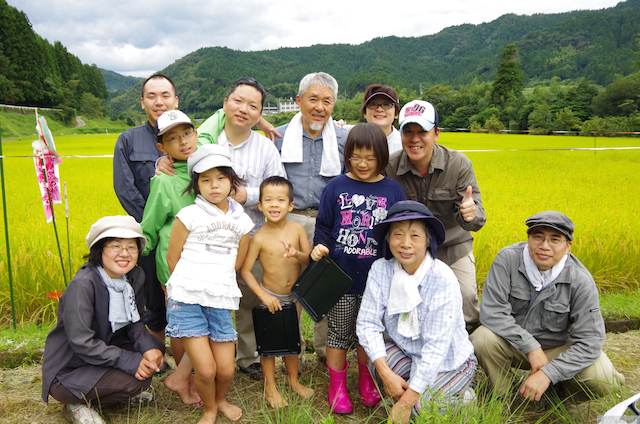 本日の10時より土佐町南泉地区にて、第一回末広稲刈りイベントを行いました。なんとか天気にも恵まれ、快晴の中稲刈りを行うことができました。上の画像は最後に記念撮影を行ったものですが、この時には曇りがちですが、無事終えるまで天気が保ったのがよかったです。残念ながら三連休の最後の日とあって、田植えの時より参加人数は少なかったですが、高知市内からの参加もあって、田植えから稲刈りまで行うことができました。