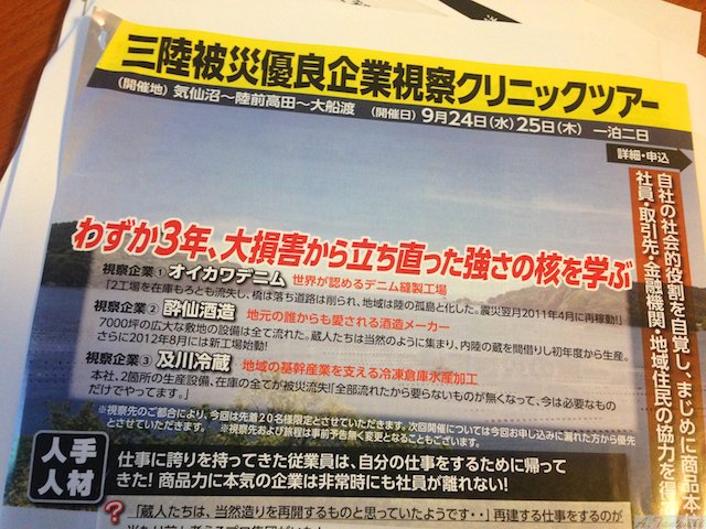 今回は船井総合研究所が主催する、三陸被災優良企業視察ツアーに参加するためです。実は私、恥ずかしながら震災後はもとより、東北地方に生まれて今まで一回も行ったことがありません。東日本大震災がおきてから、3年と半年が経ちました。震災後に被災地の様子を見に行きたかったのですが、なかなか行く予定がなく、しばらく経ってしまいました。実は社員旅行でなんとか東北地方に行けないかと考えていたところですが、社員の仕事の都合や、スケジュール的にも厳しいようで、先に延ばそうと考えていた時に上のDMが届いたのです。