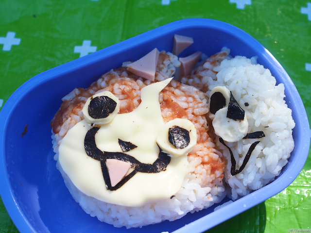 左の「ジバニャン」に関しては、誰が見てもわかりますが、実はオレンジに色付けしているのは、通常チキンライスなどにあるトマトケチャップが入ったライスになるかと予想していましたが、梅干しを練り込んだライスのようです(笑)息子がしきりに「このジバニャン、酸っぱい、酸っぱい」と中々箸が進まなかったのが印象的でした。