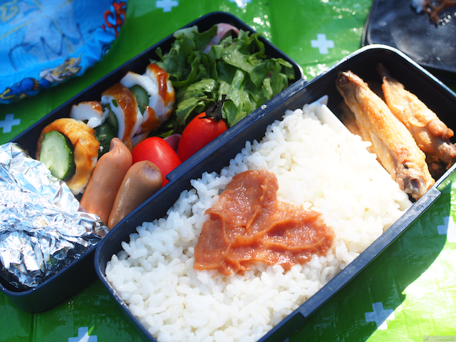 体を動かした後は、ようやくお待ちかねのお弁当タイムです。実は歩いてこの運動公園に来た時点でおなかがすいていましたので、お腹すいたーと何度も子供に訴えていましたが、聞く耳を持ってくれませんでした。