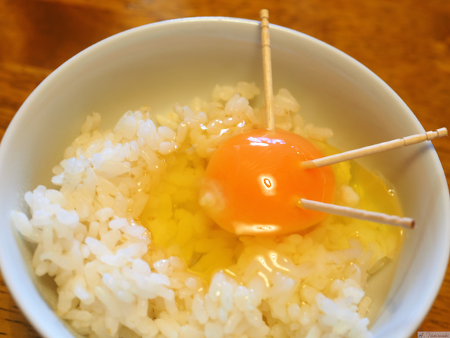 三本も立てる必要はなかったのですが、そんな気分になりましたので、三本立ててみました(笑)楊枝を立てても黄身が本当に崩れませんね。卵は本当に美味しそうに見えるのですが、残念なことに白飯が美味しそうに見えません。
