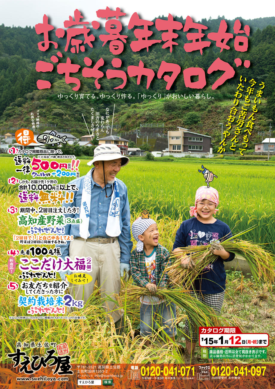 まだの方は、コチラからカタログを請求できますので、カタログだけでもご覧下さい。特典も送料が一律500円(クール便はプラス200円)、10,000円(税別)以上お買上げで送料無料、期間中2回以上ご注文頂いた方には高知産野菜をプレゼント、先着100名様に、なんとこれから発売予定のここだけ大福(2個)をプレゼント、お友達をご紹介頂いた方には契約栽培米2kgをプレゼントと、満載です。