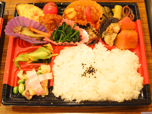 先日ある方がおっしゃっていたのですが、通常お弁当のごはんは手前にあるものですが、逆にして手前におかずを持って来るようにみると、おかずのボリューム感が凄いのがよくわかるようです。