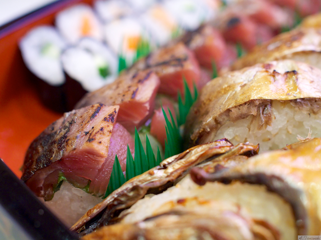 サバの姿寿司を寿司飯まで焼いたものです。高知県は皿鉢料理が有名ですが、多くの皿鉢料理の中心にはサバの姿寿司が入ってあります。やはり一度には全部食べきれないので、翌日残ったサバの姿寿司を網で焼いて食べたりするのが、昔ながらの食べ方です。寿司飯の酸が抜け、サバの脂もいい加減に落ちて、これが美味しいです。今回も酸味がいい具合に抜け、美味しいお寿司でした。