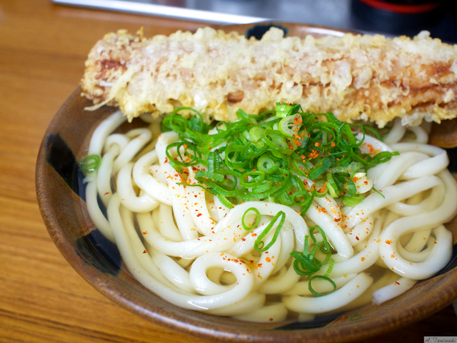かけうどん2玉にちくわの天ぷらを乗せてみましたが、圧倒的な存在感がおわかりいただけると思います。熱々の揚げたての天ぷらは美味しくて、うどんとよく合います。ちょうどこの日は運良く並ぶことなく、入ることができました。ある方とこのお店について話したことがあるのですが、実際に並ぶと入口にある揚げ場が自然と目に入ります。待っている間ずっとそれを見るわけですから、天ぷらを頼まん人はおらんでしょう!という話になり、よく考えられた店づくりであるという結論になりました。