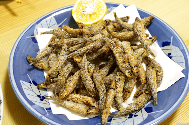 小魚の表面に小さいものが付着してるので、恐る恐る箸を伸ばしてみましたが、これが超美味しいこと!!トウゴロイワシの松傘揚げと呼ばれるものだそうです。要はイワシの小さいものを、鱗を取らずそのまま揚げたものです。揚げるとその鱗がはがれたようになり、このような表面になるのです。鱗が口の中で残って嫌な感じがするのが通常ですが、全くそんなことはありません!逆にサクサク感があってほんとに美味しいお魚でした。食べ方一つでこうも変わるもんなのかと驚きました。