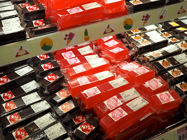 さて、末広ショッピングセンター本店、おおとよ店ともお正月用の商品を多く販売しておりますので、ガラッと変わった売場になっております。その中の一つで、他県から来られた方は珍しい!と思われるのは、羊羹の売場です。この年末が差し迫った時に他店のスーパーを視察する余裕がありませんので、はっきりとは言えませんが、自社のようかんで約6尺(約180cm)の売場があるのは、全国的にも当店だけかもしれません。