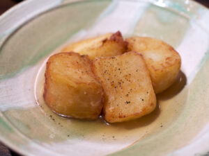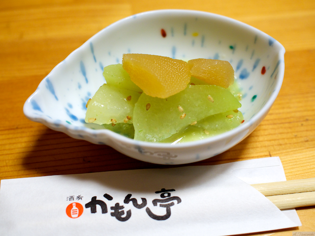 上の突き出しは、高知ではよくたべるチャーテをなんとぬたで和えたものです。チャーテとは、「ハヤトウリ」「インドウリ」と呼ばれるウリ科の植物です。高知県ではチャーテを栽培する人が多く、塩漬けにしたり、炒め物にしたり、煮付けたりと色んな料理用途があります。コリコリとした食感がクセになる美味しい野菜です。