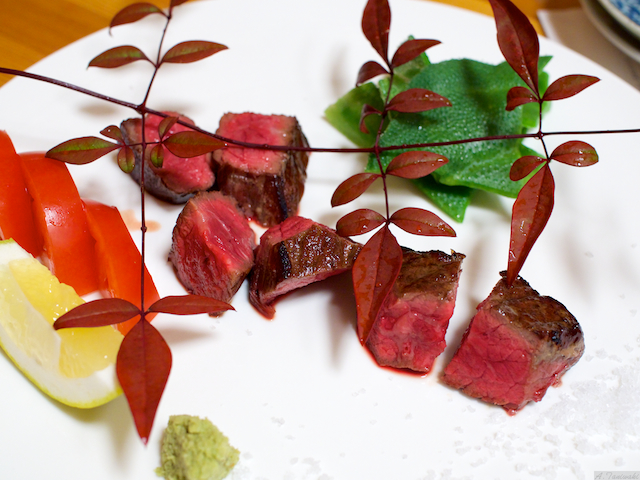 最後の締めに土佐あかうしの藁焼きです。過去のブログにも紹介したことがありますが、盛りつけ方がまた異なっており、更に美味しく感じました。藁焼きならではの香ばしい香りを感じることができ、噛めば噛むほど味わい深い土佐あかうしの赤身が本当に美味しかったです。脂っこさは全く感じませんので、最後でもサラッと食べることができます。
