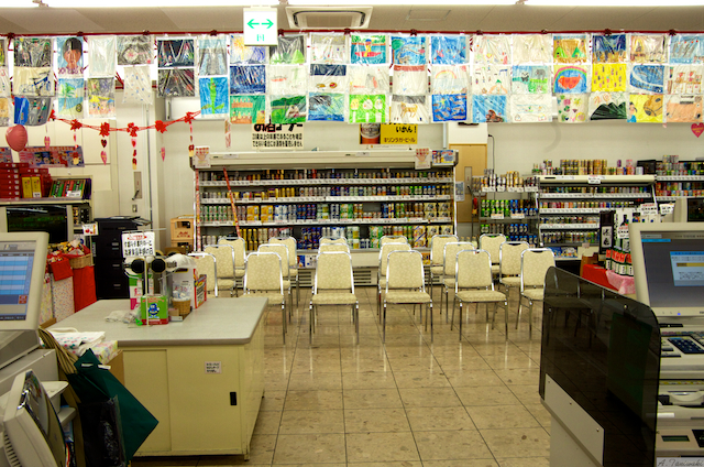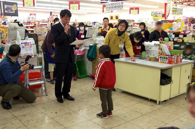 昨年までは入賞したお子様が表彰状を取りにこられると、その都度当社のスタッフがバッと集まって、表彰式を行っていました。今年はちょっと趣向を変え、せっかく表彰式をするのだから、盛大に行おうと合同表彰式を行うことにしました。通常はビールのケースがたくさん並んでいる売場ですが、それらを撤去し、表彰式会場としました。画像は残ってませんが、お子様の胸には、お花のバッヂを用意させてもらいました。
