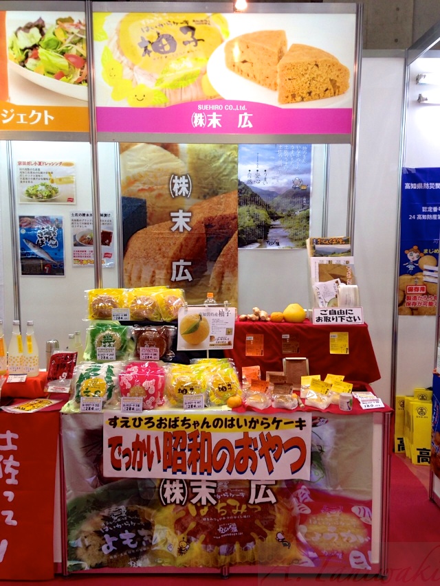今年も例年どおり、高知県ブースにて、主にはいからケーキの提案をさせていただく当社のブースがあります。当社が高知県ブースにいるように、各都道府県のブースがある中に、いくつかの各企業(メーカー)ブースがあります。大手NBブランドのメーカーさんのブースは、それはそれは大きなブースですが、我々にとったら十分な広さです。この展示会は三日間開催されますが、一日で約3万人が訪れる業界最大の展示会です。主通路には人が溢れ返り通れなくなるほどです。