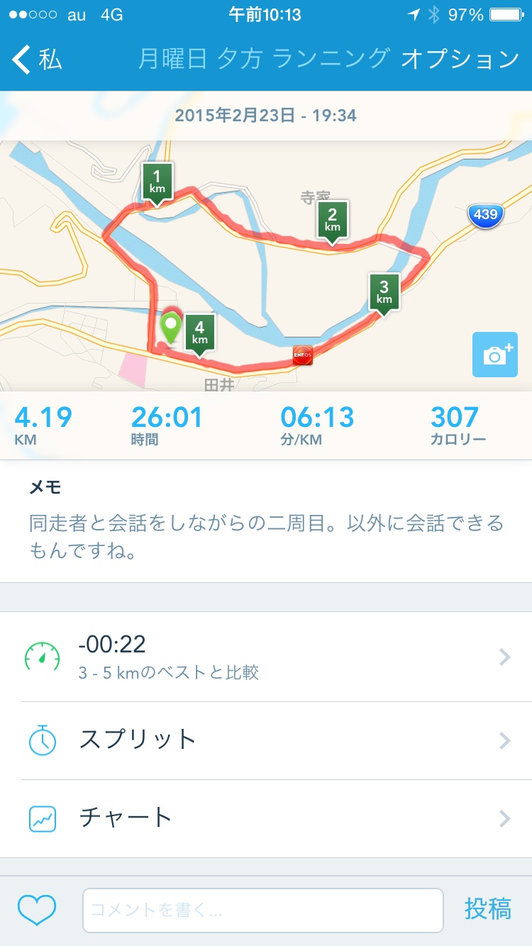 さて、本題に入りますが、昨日も仕事を終え従業員とその友達と一緒に走ってきたわけですが、少しずつ体が慣れてきているのを感じるようになりました。いつも末広ショッピングセンターから本山町寺家方面に行く一周コースを走っておりますが、一周で約4㎞あります。約4㎞走って、6分/kmのペースぐらいで走ることができるようになってきました。走り始めた頃はノンストップで走ることもできず、ランニングの途中にウォーキングしたりして、7分/kmぐらいでした。