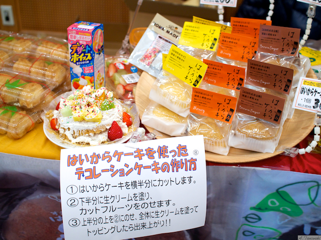 更にはご家庭でも簡単にできるケーキづくりということで、通常のはいからケーキを使ってデコレーションケーキの提案をしました。お子様には目につくようで、多くのお子様がこのケーキを触ろうとする、食べようとするのにはビックリでした(笑)展示物ですので全然触ってもらっても大丈夫なんですけどね。このデコレーションケーキは、9歳の娘が作ったものです。