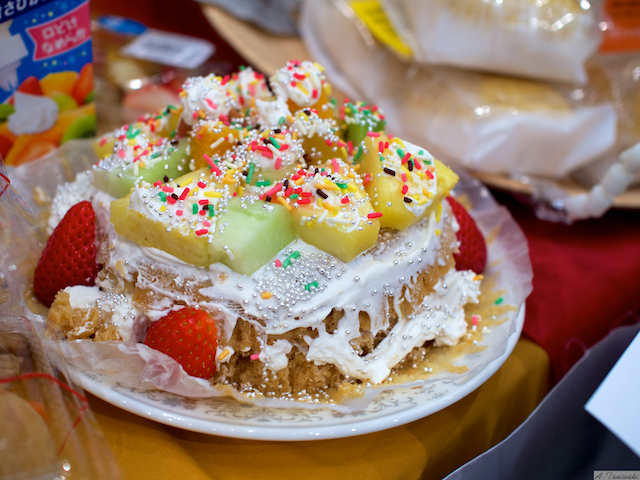 作るといってもはいからケーキをスポンジがわりにするものなので、簡単にできます。はいからケーキを横半分にカットして、生クリームを塗りカットフルーツを盛り付けます。上半分に同様にします。最後にちょっとしたトッピングをして出来上がりです。