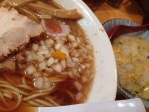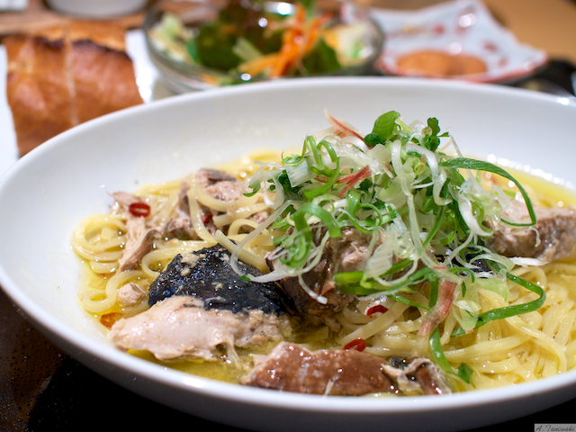 鰹のタタキではありませんので、中まで火が通っていますが、これがペペロンチーノのパスタとよく合うのです。オリーブオイルもふんだんに使っており、パスタの麺が浸るほどでした。食べた感じではどちらかと言えば、洋風のパスタというより、ラーメンに近い感覚かもしれません。