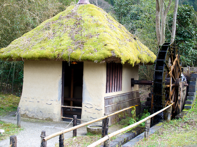 敷地の中に入ると、水車と水車小屋があって実際に可動しており、お米を打っていました。