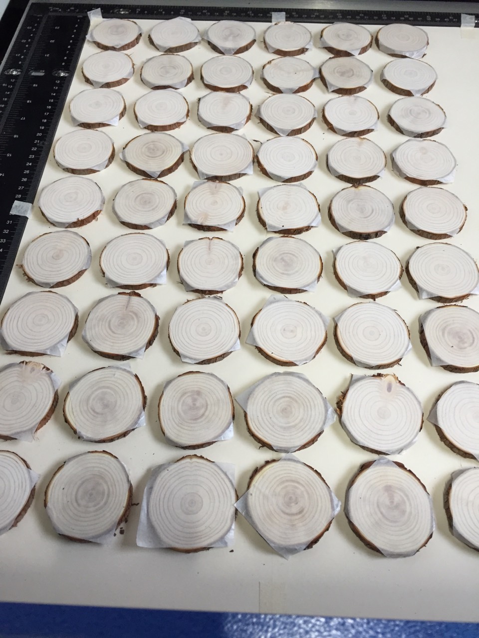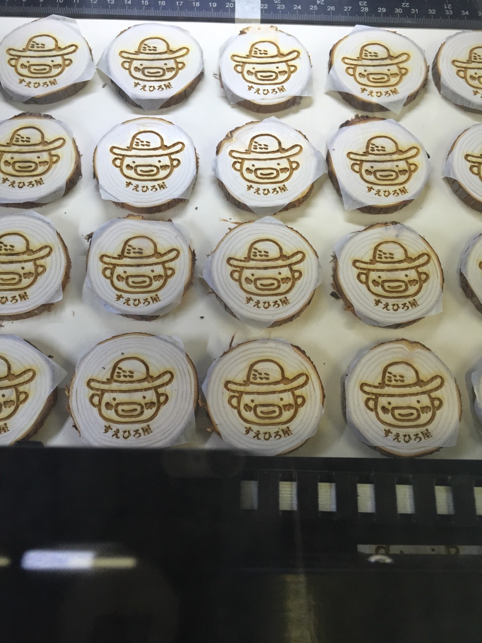 レーザー加工されると、このようにキレイにすえひろ屋おんちゃんのマークが入ります。微妙にサイズや形が違う檜の輪切りに上手マークが入るものですね。