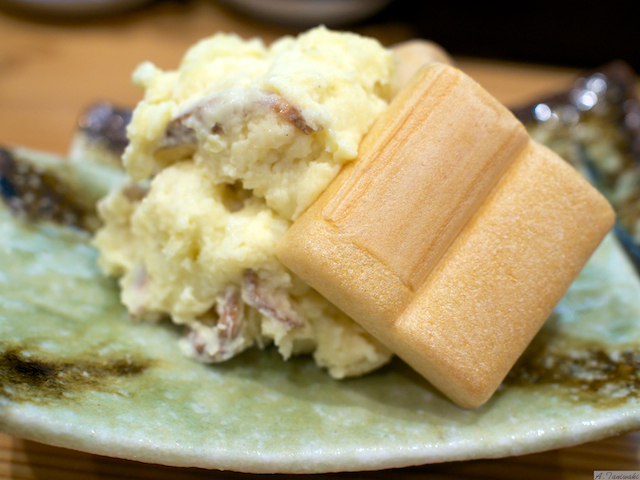 いぶりがっこのポテトサラダです。「いぶりがっこ」とは秋田県湯沢市雄勝地区(旧雄勝郡雄勝町)の漬物屋(雄勝野きむらや)が売り出したいぶり漬けの商標だそうです。漬物がポテトサラダの中に入っても、美味しいとは驚きです。