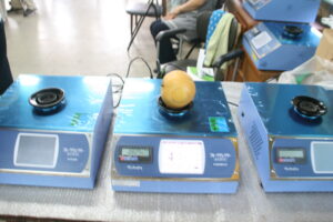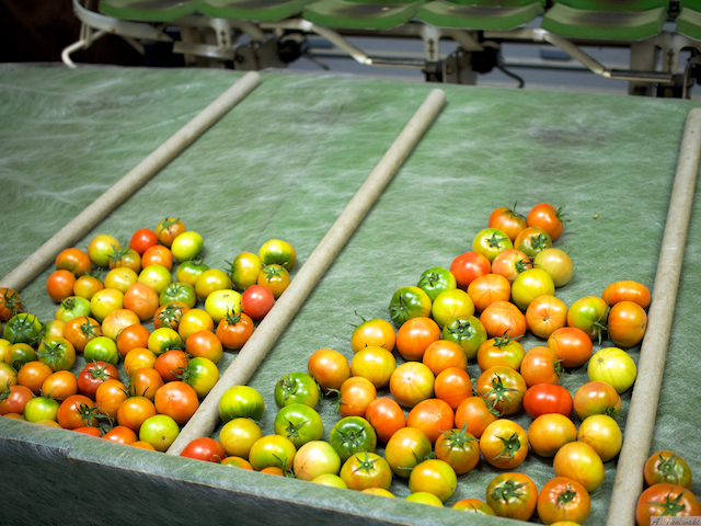まずは事務所にてトマトの自動選別を見学しました。トマトの重量によって自動的に選別される機械がありました。普段見慣れないもので、単純な仕組みでもついつい見とれてしまいます。1時間ほど見ていても飽きませんね。