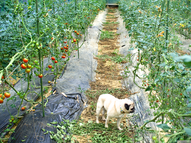 パグパグ畑のネーミングは、愛犬パグから取られているのがこの様子を見るとよくお分かりいただけるかと思います。実際に採れたてのトマトを食べさせてもらったり、美味しいトマトの見分け方も習いました。実際に農場まで足を運んで、生産者と直接お会いすることの大切さを改めて感じました。