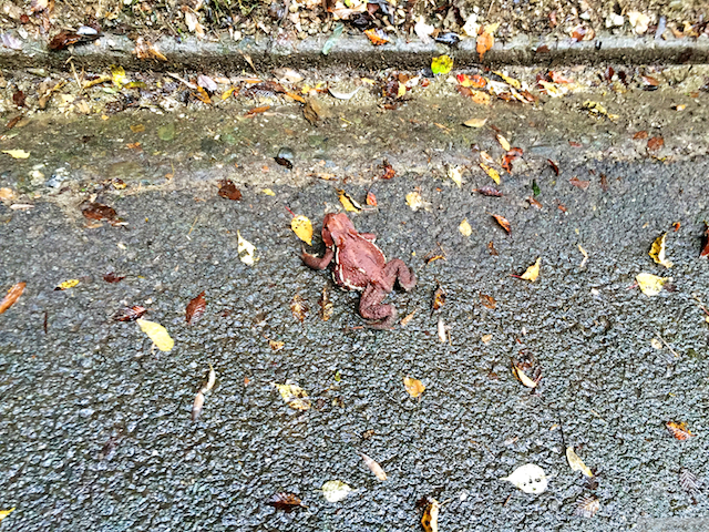 二周目のアップダウンにやられました・・・一周目にはそう感じなかった坂が、とてつもない急な坂に感じます。なんとか歩くことなく走って来ましたが、後半はむしろ歩きまくりでした。アップダウンにようついていけないのと、膝も次第に痛くなってきて、歩くことの方が多くなっていました。ですので、この上の画像にあるように、たまたま道路に出て来たカエルを撮る余裕があったのです。