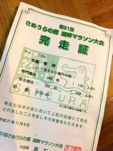 第31回さめらの郷「湖畔マラソン」大会のマラソンの話をしましょう。結果から言いますと、2時間35分46秒と全く不本意な結果となってしまいました。密かに2時間を切るという目標を持っていましたが、そんな目標を掲げたのが恥ずかしくなるぐらい、目標とは遠く離れた結果でした(汗)