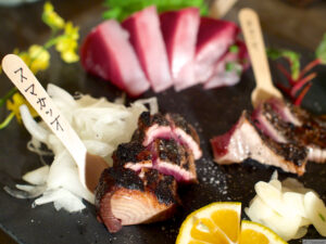 残念ながら、タレの鰹のタタキを撮り忘れましたが・・・たまたまかもしれませんが、塩タタキも二種類の鰹を食べ比べることができました。スマガツオと本カツオの食べ比べです。
