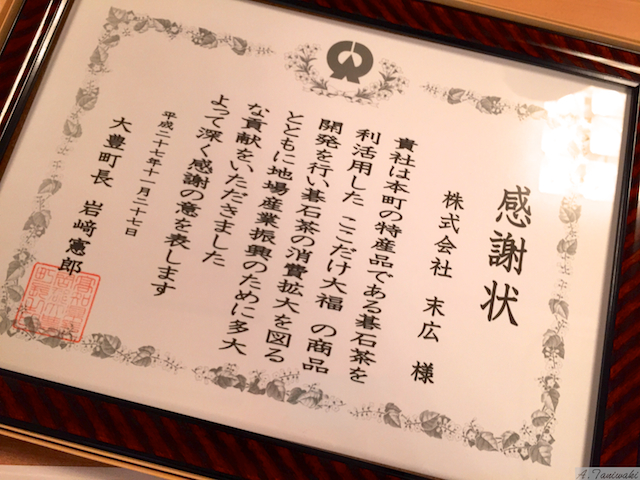 感謝状の内容はこのような感じです。発売して1年間で約120万円という結果でしたが、決して満足した結果ではありません。碁石茶という非常に希少価値のあるお茶を使っておりますが、まだまだ売れるはずではないかと思っております。現在、リニューアルを検討しており、更にいい商品に仕上がるはずです。