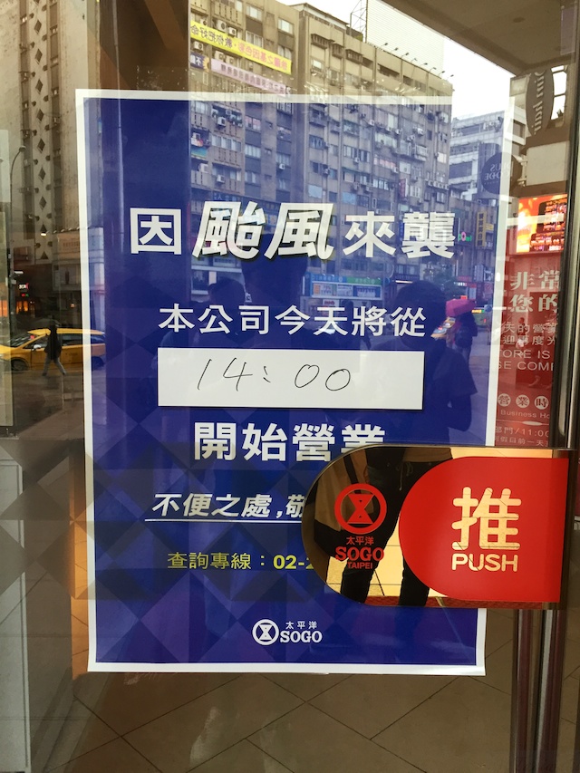 台湾旅行記もこれで最終となり、次回の番外編にて終了とさせていただきます。台湾での最終日は、日中は台北市内にてショッピングや食べ歩きをしたのですが、台風襲来により、まさかの店舗が臨時休業ということに合いました。日中は大して雨風はきつくなかったのですが、大きな百貨店が臨時休業でした・・・こちらでお昼に美味しい小籠包を食べたかったのですが、14:00まで閉店ということでしたので、断念せざるを得ません。